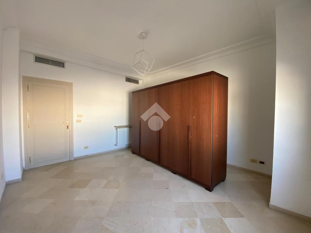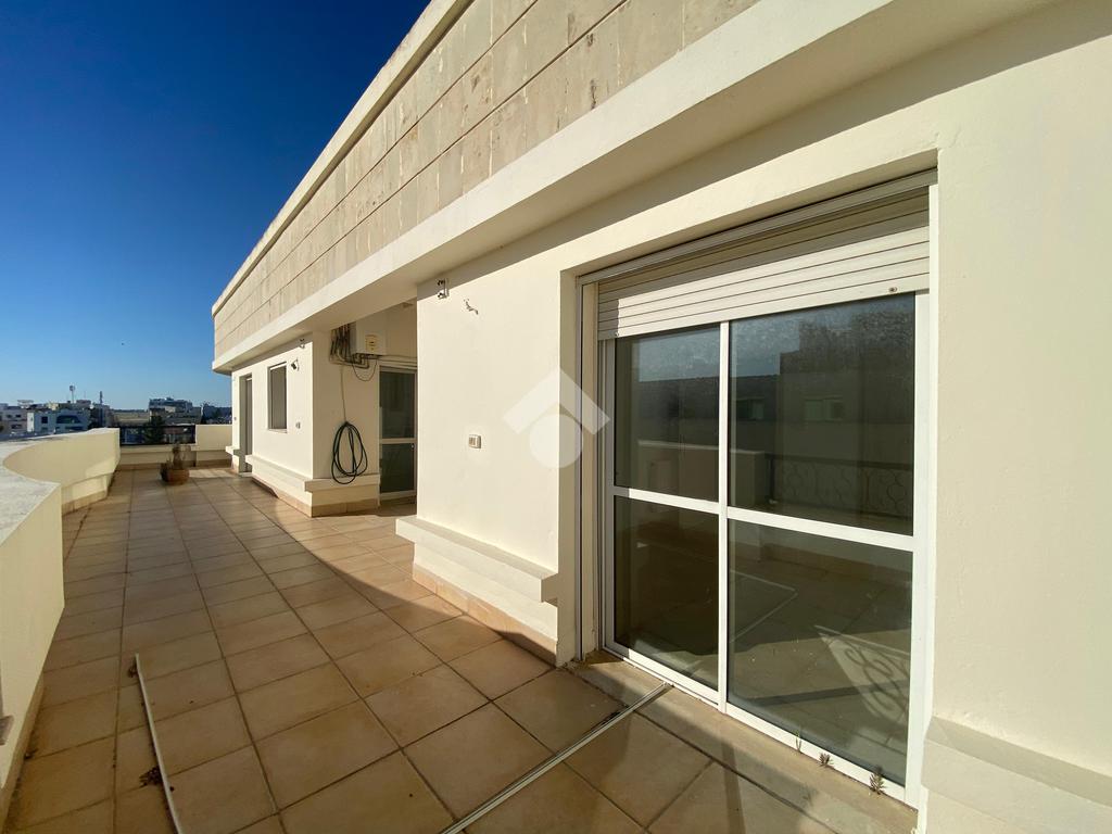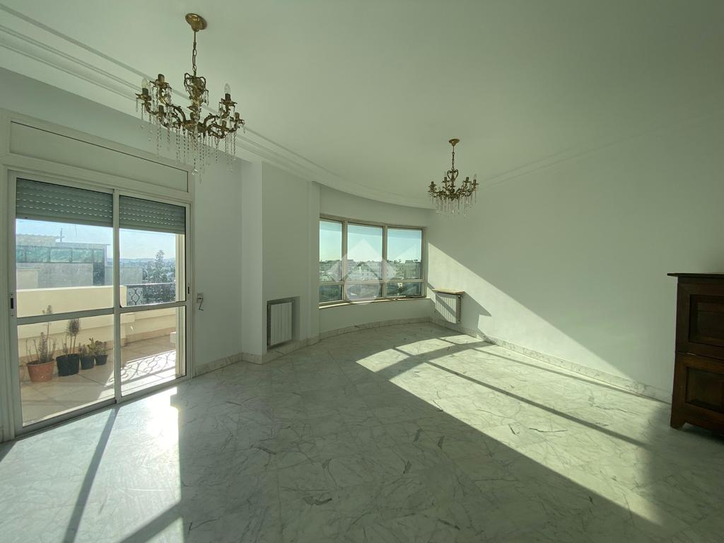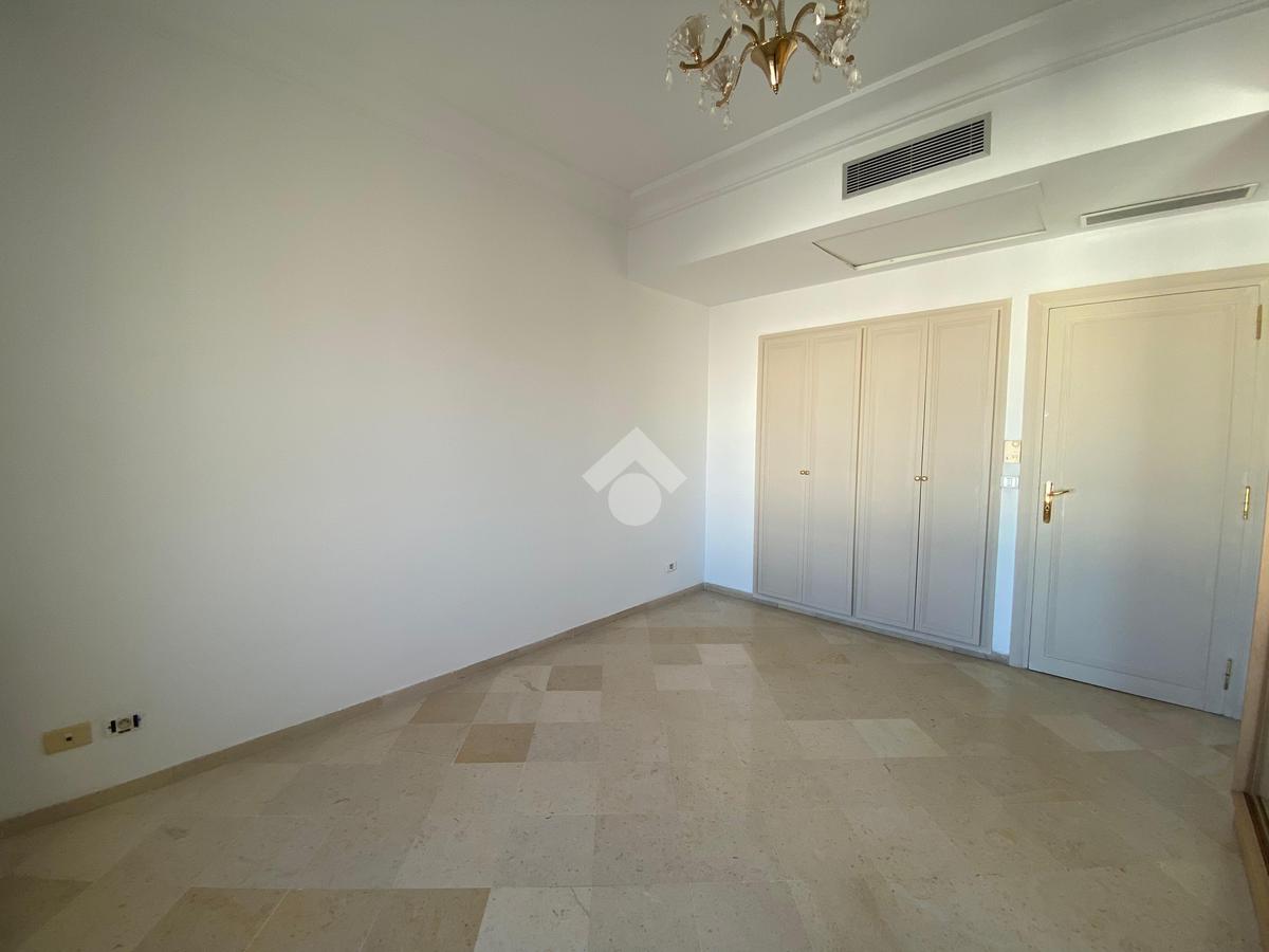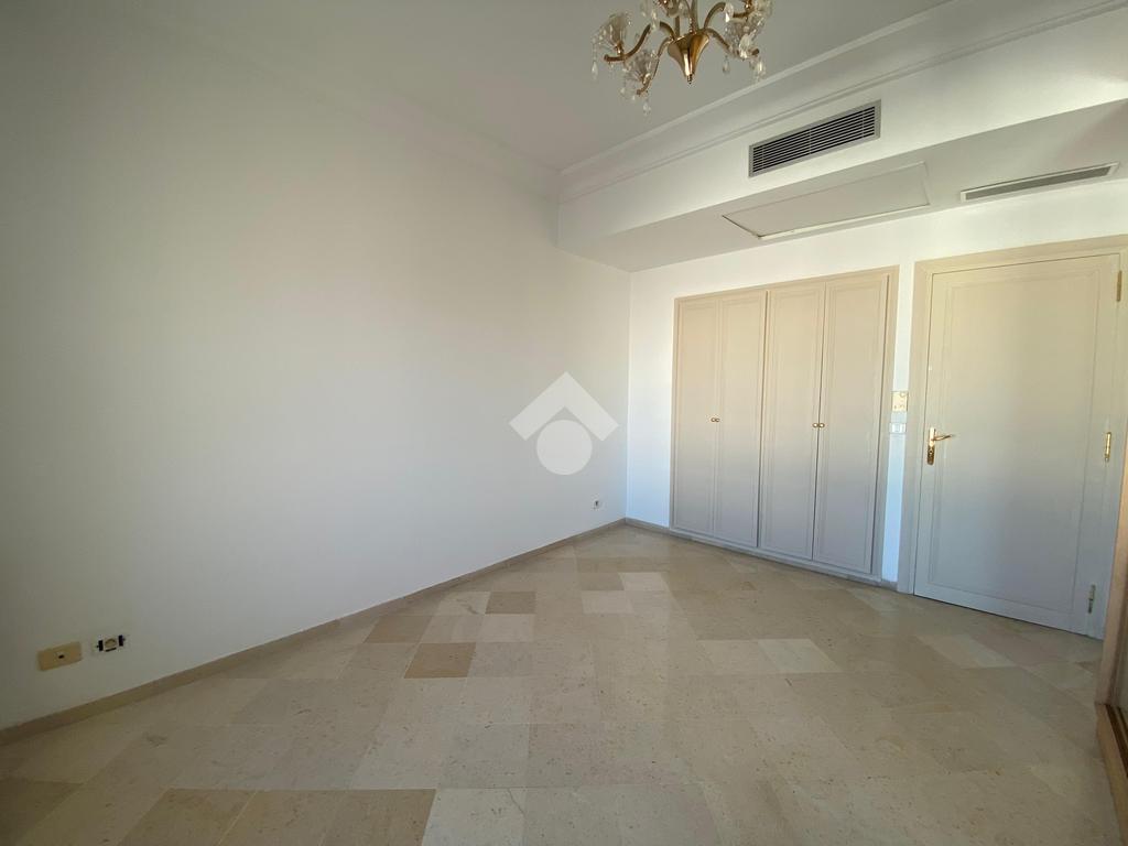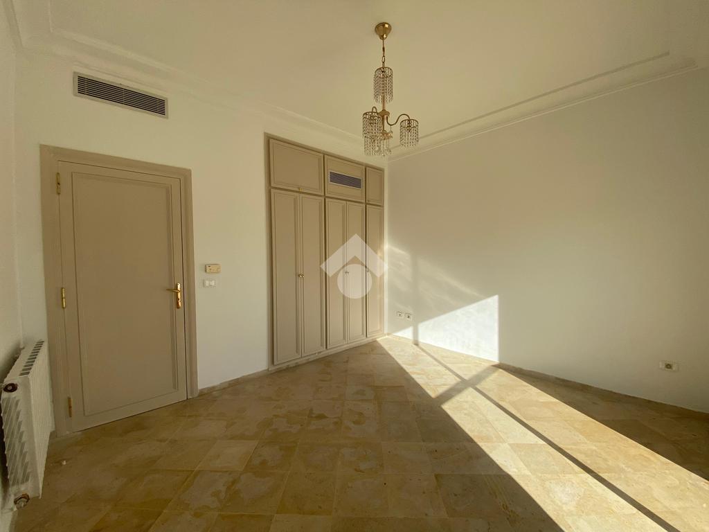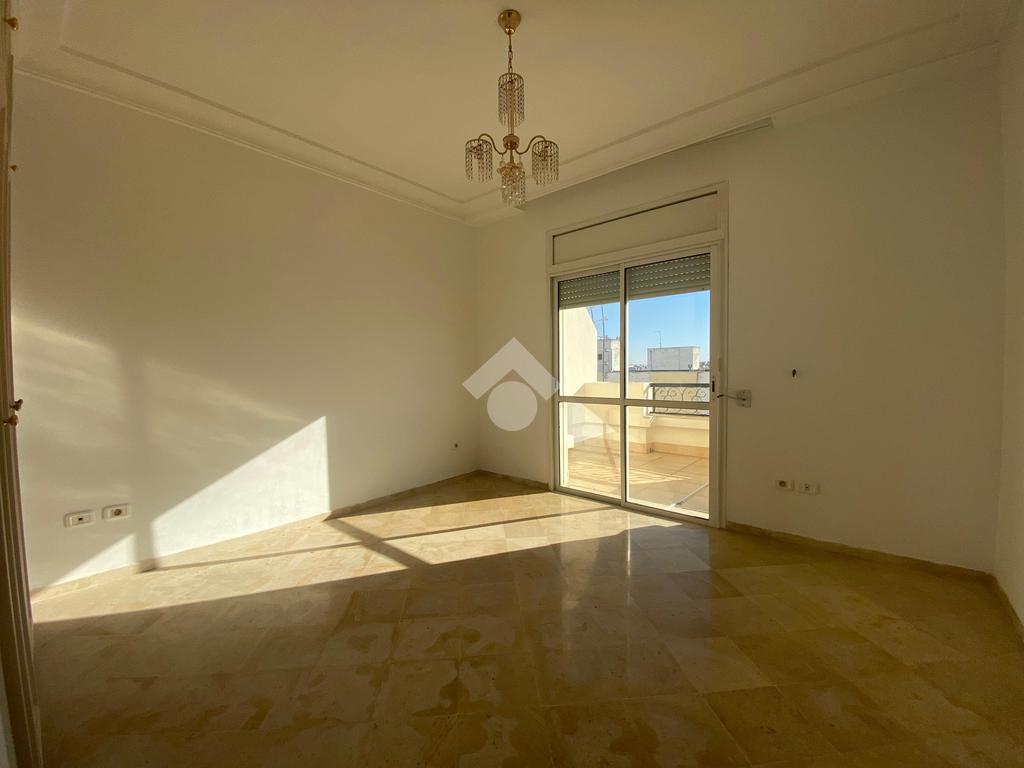 L’entrée s’ouvre sur un salon revêtu de marbre Thala, bénéficiant d’une luminosité grâce à ses ouvertures, et prolongé par un balcon offrant une vue dégagée.