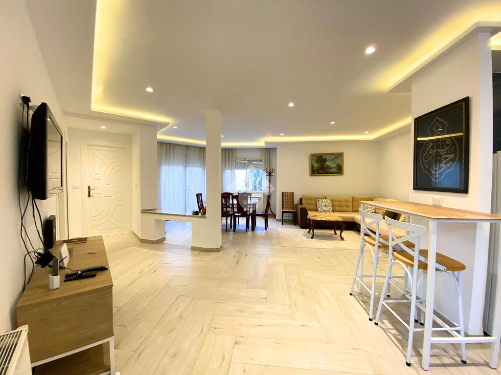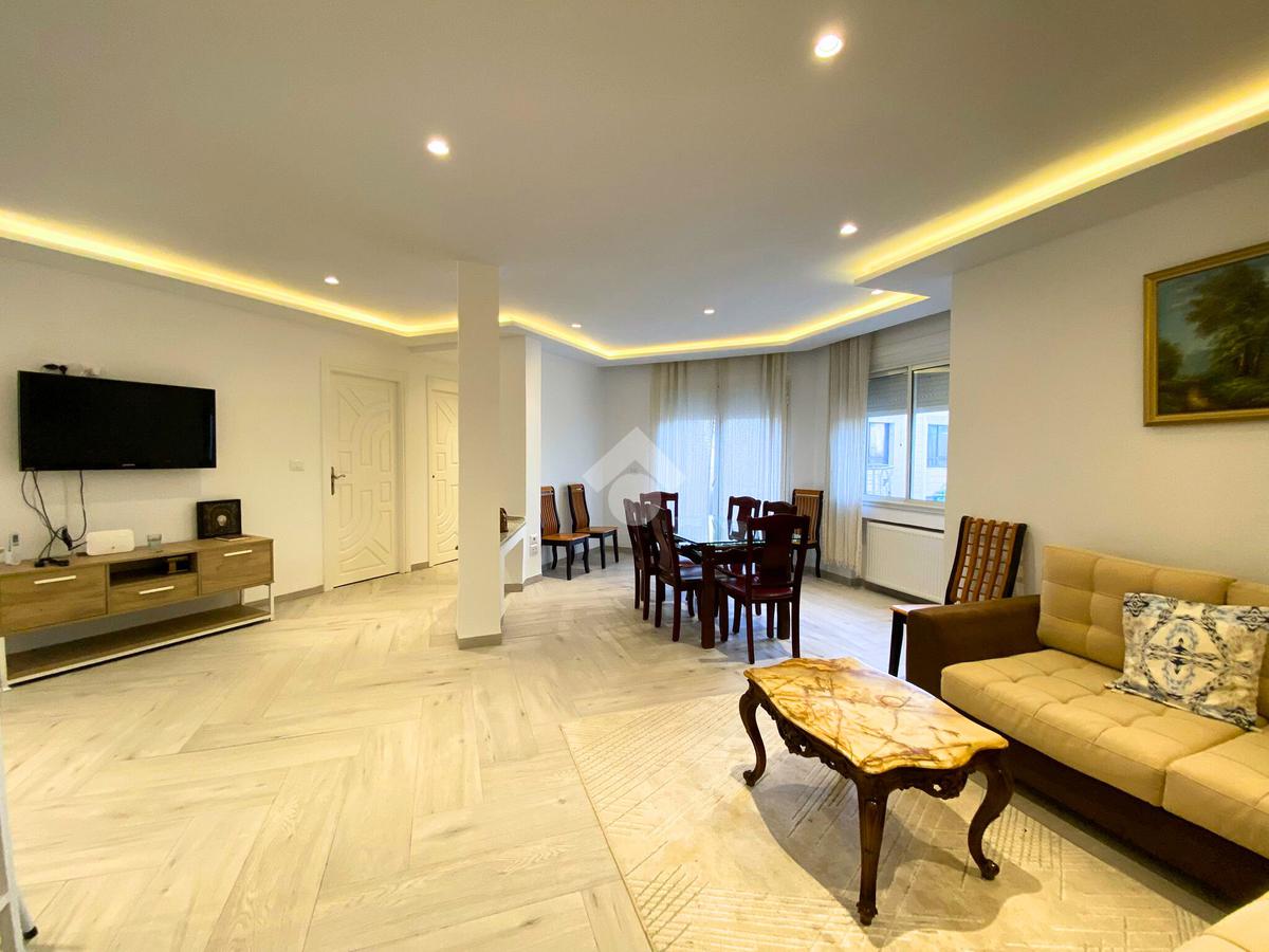 L’espace de vie se compose d’un salon et d’une salle à manger revêtus de grés dans la masse, prolongés par un balcon.