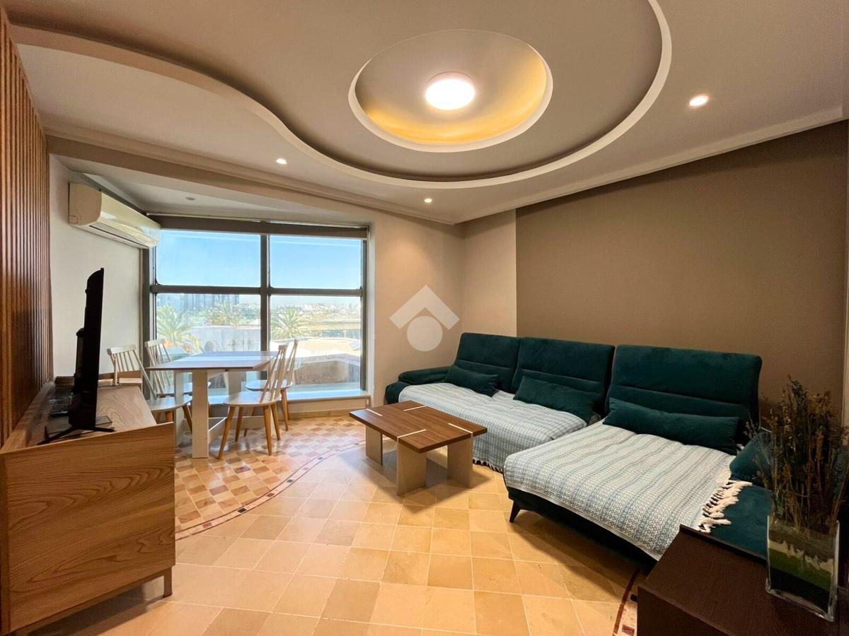L’espace de vie se compose d’un salon revêtu de marbre thela, qui baignent de lumière grâce à son ouverture.
