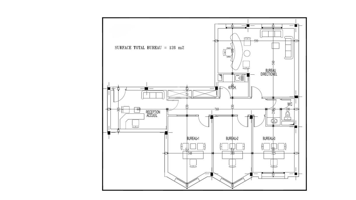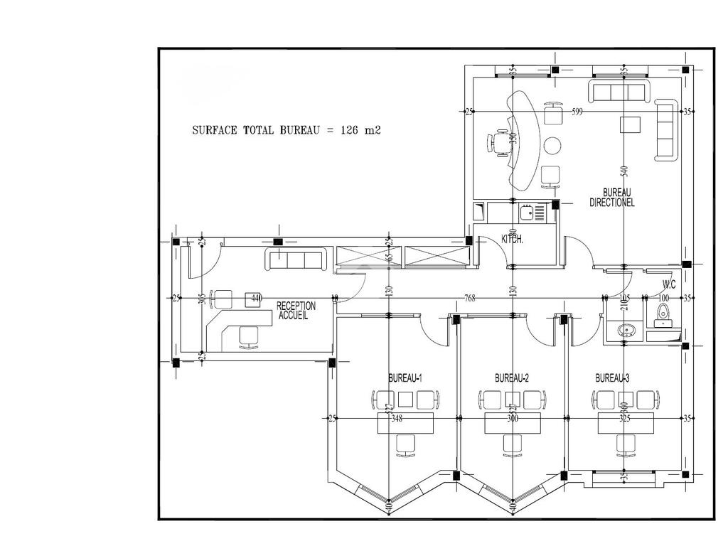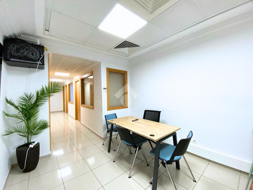 L'espace de travail abrite un hall d'accueil, suivi de trois piéces de bureaux, d’une salle de réunion, d’une kitchenette et de deux points d’eau.